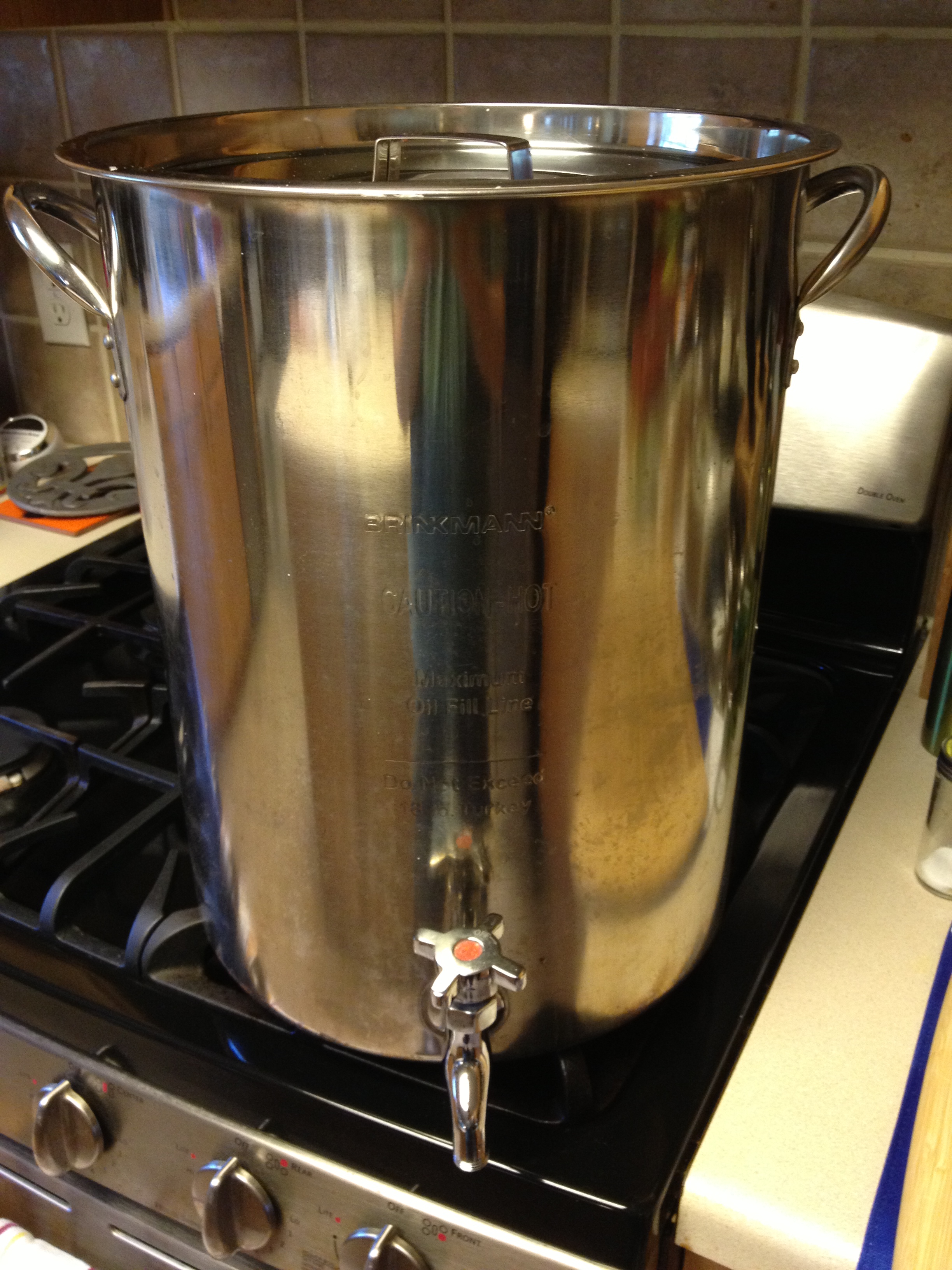 Preparing a 5-gallon mead must is as simple as heating 2-3 gallons of water on the stovetop, just enough to dissolve the honey (around 110°F), and mixing that with top-off water in the fermenter. I used the 7.5-gallon aluminum pot that usually serves as my hot liquor tank: